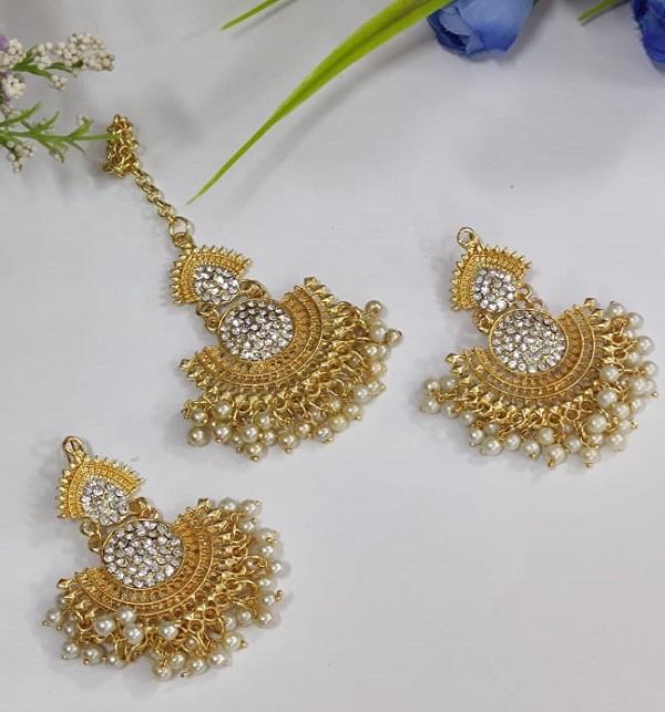 Enhance your festive look with these traditional earrings, featuring matching matha patti with elegant pearl work, perfect for weddings and parties.