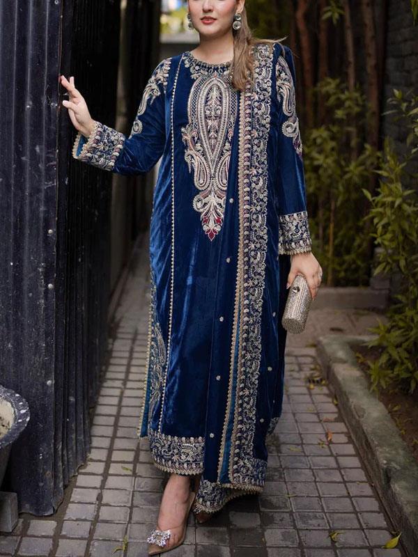 Velvet Spengle Embroidered Party Dress with Embroidered Velvet Shawl & Silk Trouser (Unstitched)